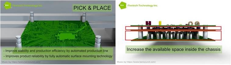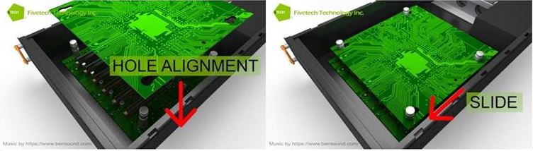 Fivetech SMT Spool provides the horizontal quick positioning function. Simply place the PCB down towards the hole and slide horizontally, it will connect the motherboard in one second. Compared to the traditional way that needs to lock the screws one by one, our SMT Spool can save nearly 95% of the assembly time and also significantly reduce labor costs.